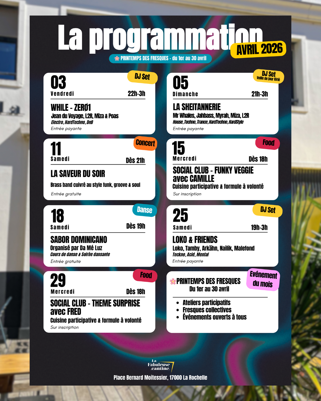 La Fabuleuse Cantine est également un lieu de vie, de rencontres et d’événements s’ouvrant à tous. Concerts, comedy club, expositions, projections, conférences, débats, friperies, drag show… Lieu incontournable de la scène musicale rochelaise, elle propose une programmation inclusive, respectueuse de la parité, du jeudi au samedi.